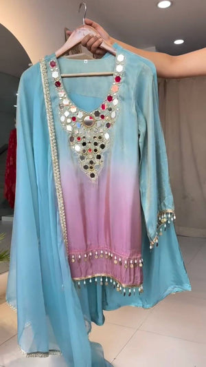 Upgrade your festive and party wardrobe with this designer 3-piece outfit, crafted to perfection with luxurious fabrics and elegant detailing. This set includes a stylish top, flowy plazo, and a graceful dupatta – making it the perfect blend of comfort and glamour.
