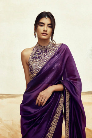 It is paired with a bold yet graceful halter neck blouse, fully embroidered in intricate mirror and marodi work, tailored in luxurious silk organza. This 2-piece ensemble is perfect for receptions, weddings, and cocktail events where timeless sophistication is key.