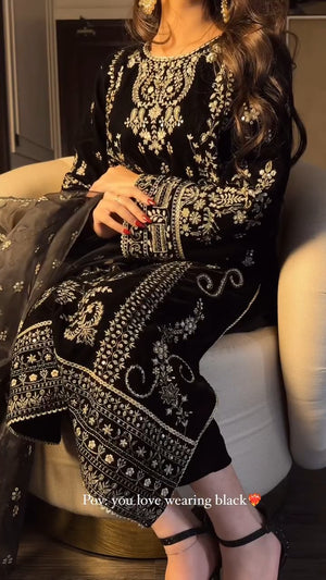 ✨ Because black is not just a color, it’s an emotion. Adorned with intricate golden embroidery and paired with a delicate organza dupatta for a royal festive look.