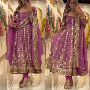 Heavy Chinnon Silk Embroidery Sequence Work Anarkali Suit Set with Pant and Dupatta