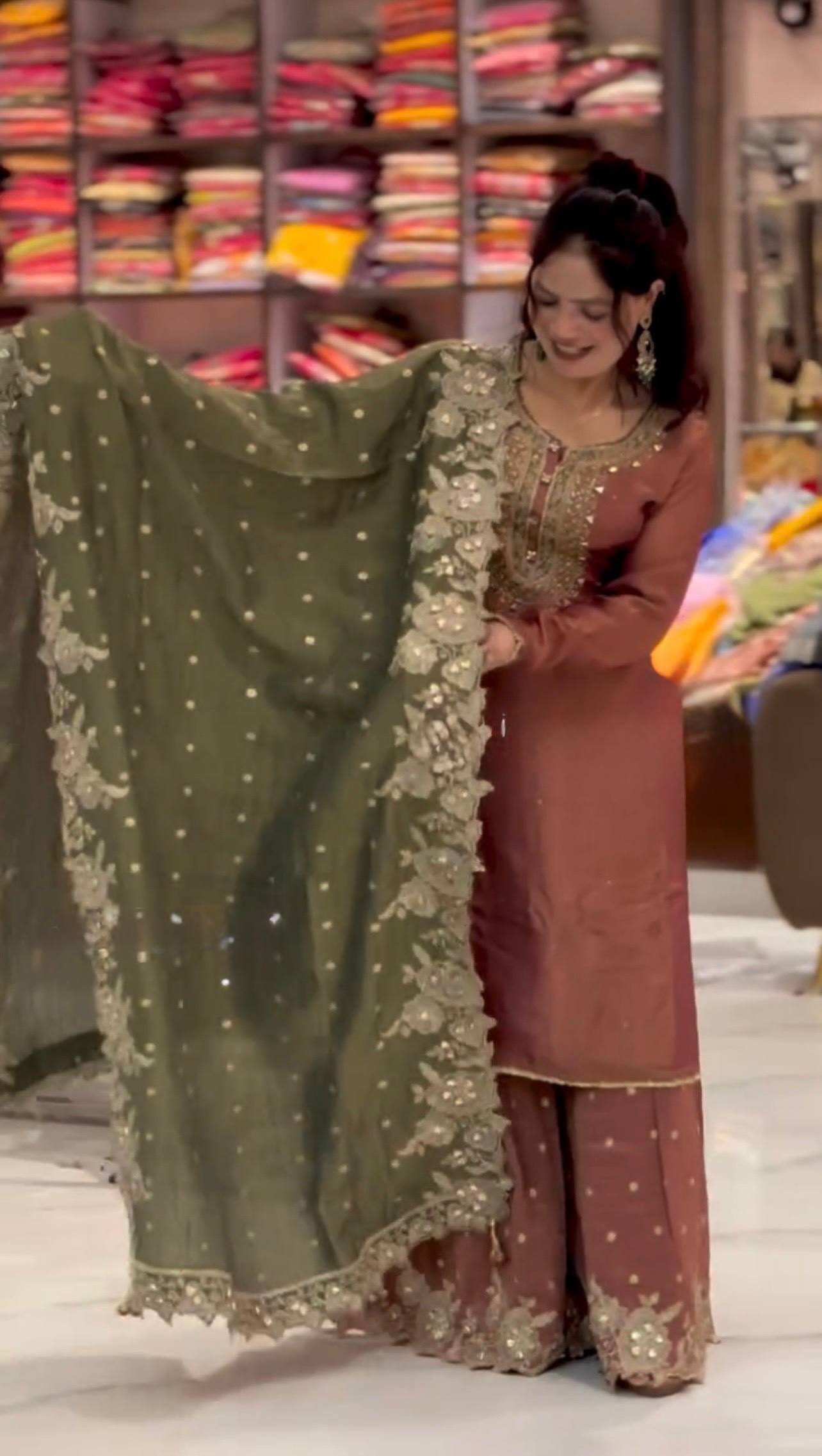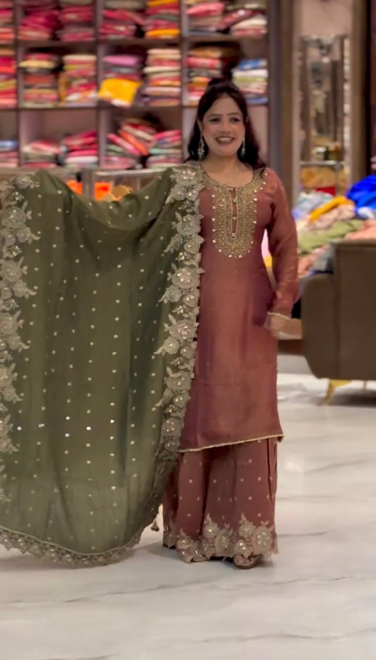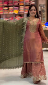 A premium fully stitched ethnic wear set designed in rich Fendy Silk, beautifully enhanced with embroidery sequence work. Paired with a full-flair sharara palazzo and matching dupatta with lace border detailing, this outfit is perfect for festive gatherings and elegant occasions.