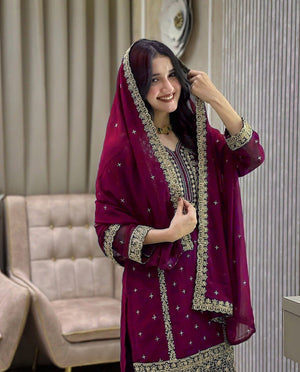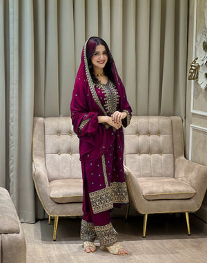 Presenting a festival-special designer Top–Pant–Dupatta set crafted in heavy Faux Georgette fabric. Adorned with rich embroidery and sequence work, this elegant outfit is designed to deliver a perfect blend of festive glamour and everyday comfort. Fully stitched and ready to wear, it is ideal for celebrations, parties, and special occasions.AC-7094