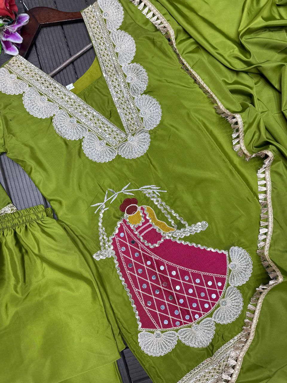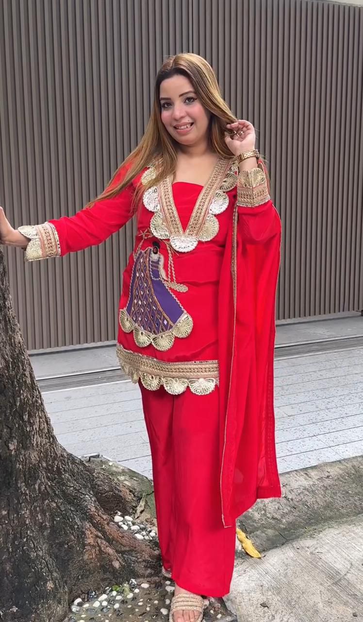 Presenting a stylish new party wear set featuring a beautifully embroidered top, matching sharara, and elegant dupatta. Crafted from premium heavy crepe fabric with fine coding embroidery work, this fully stitched 3-piece outfit offers both comfort and designer appeal for festive and special occasions.[HB-210]