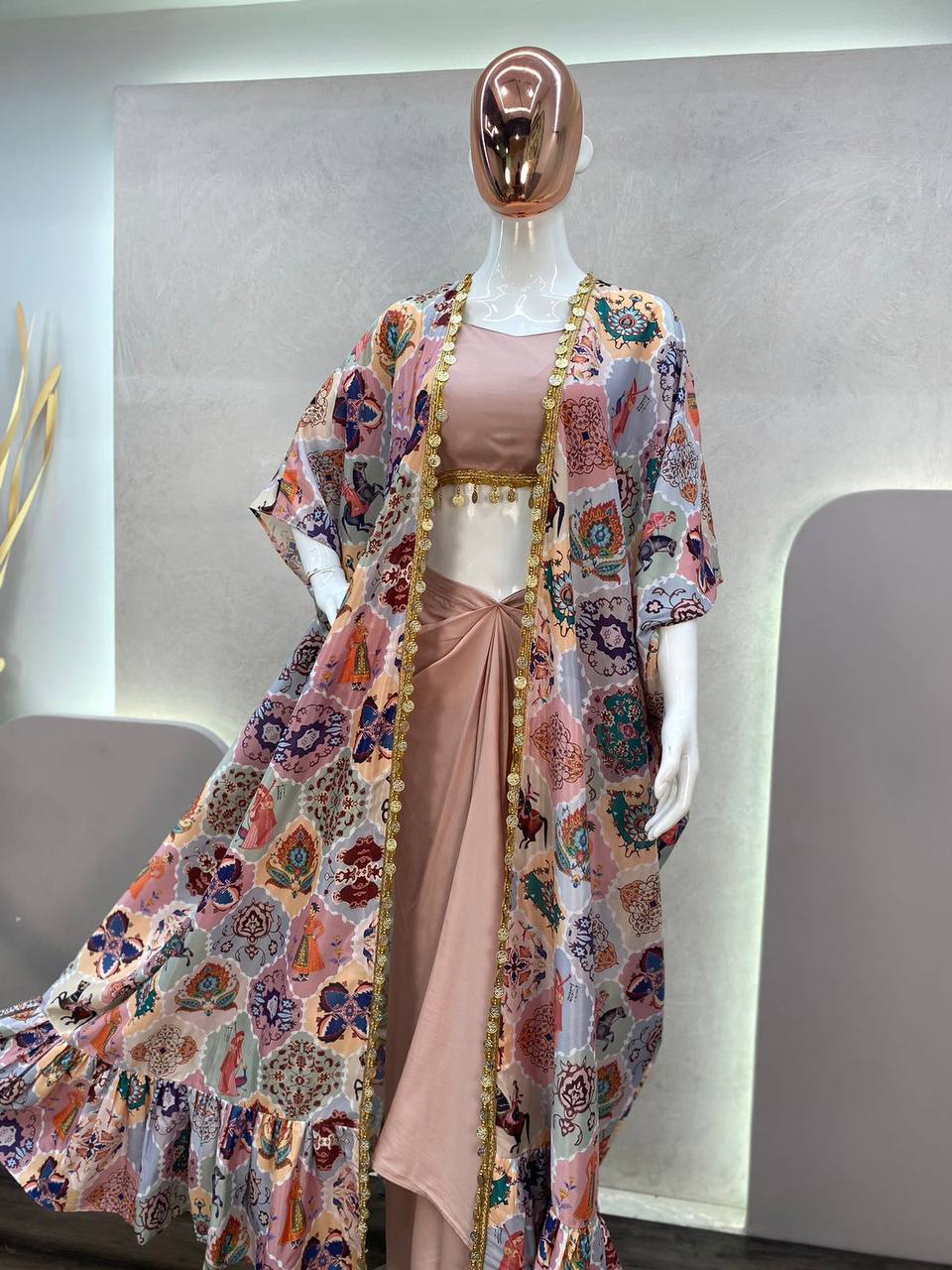 Peach Color Western 3 Piece Set With Digital Print Shrug Party Wear Western