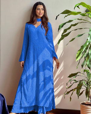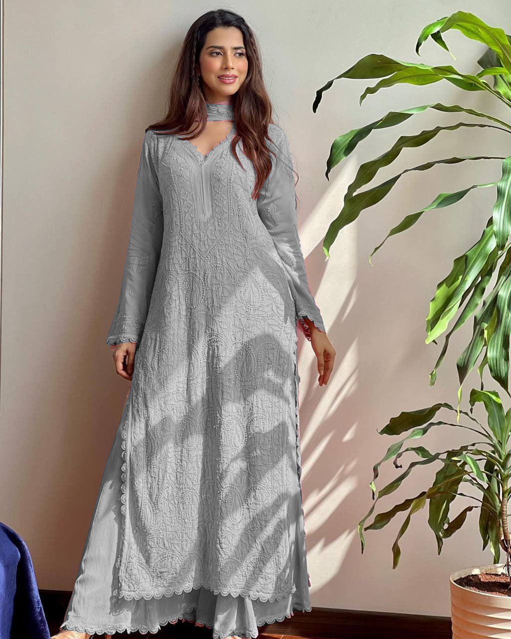 Viscose Georgette Chikankari Kurta With Palazzo And Dupatta