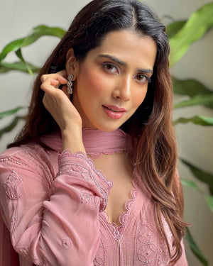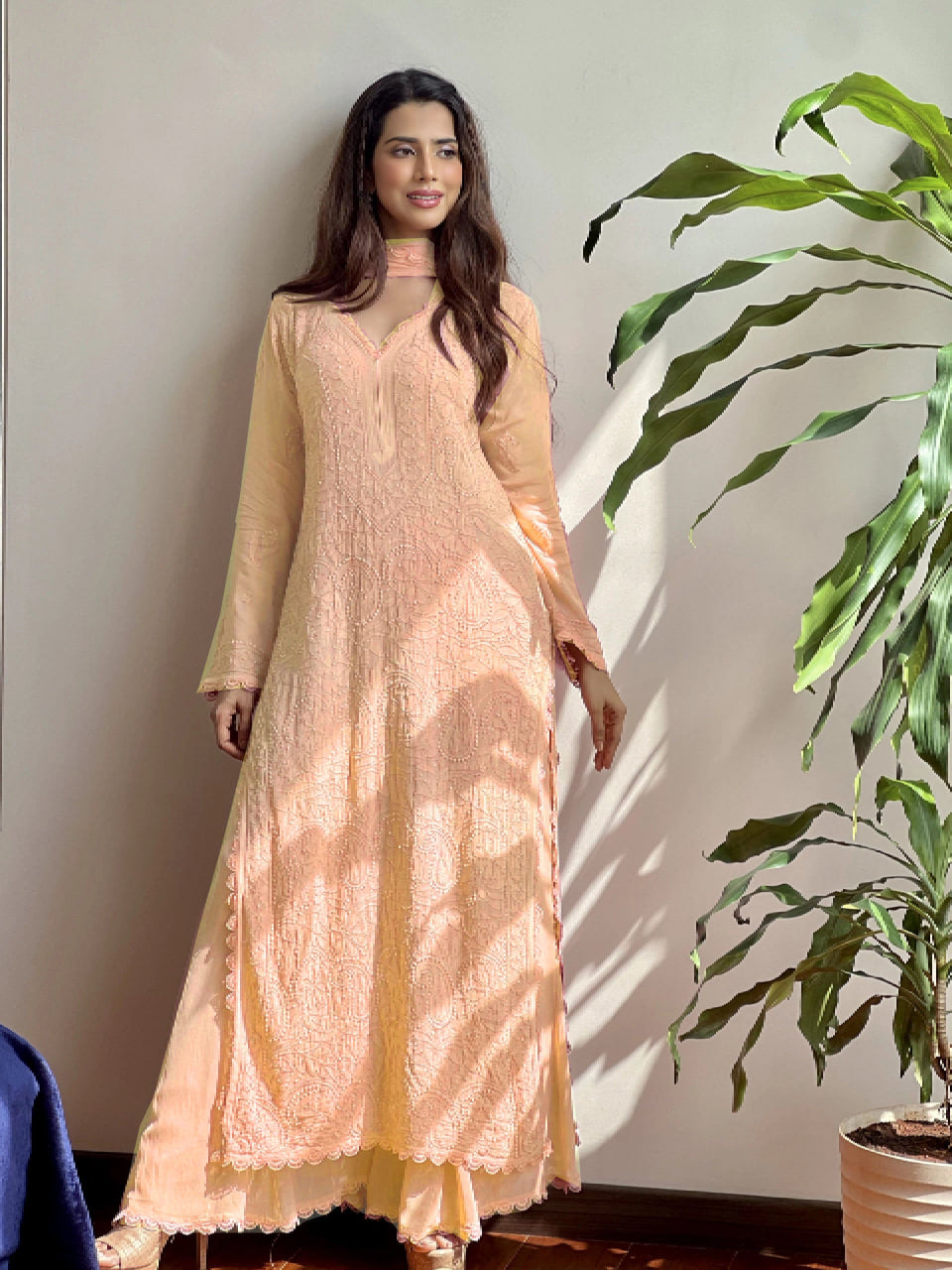 Step into the season of celebrations with this embroidered georgette kurta set, designed to redefine ethnic elegance with a couture-inspired touch. The delicate embroidery, scalloped details, and graceful silhouette make it a perfect statement ensemble for festive soirées and wedding celebrations.