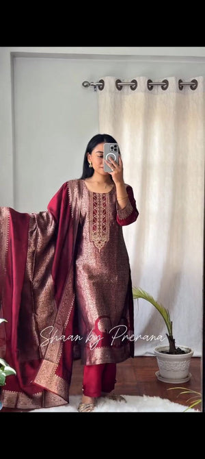 New arrival Asopalav suit set crafted in premium pure Banarasi fabric with beautiful jacquard weaving, traditional designs, and hand zari detailing. This branded collection includes a matching top, pant, and a pure woven zari jacquard dupatta. Comes with pure cotton lining for comfort and a shimmering bracelet set to complete the festive look. Perfect for gatherings, celebrations, and cultural events. MT